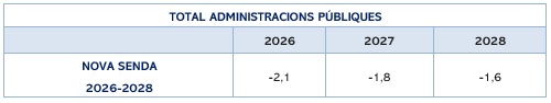 El 2026, el conjunt de les Administracions Públiques haurà de situar el seu dèficit en el -2,1%. Per al 2027 i el 2028, es reduirà al -1,8% i el -1,6% respectivament.