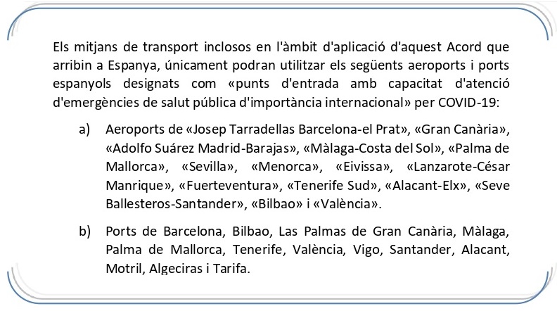 2. Ordre PCM / 531/2020, de 16 de juny, per la qual es publica l'Acord de Consell de Ministres de 16 de juny de 2020, pel qual s'estableixen els ports i aeroports espanyols designats com "Punts d'entrada amb capacitat d'atenció a Emergències de Salut Pública d'importància internacional", segons el que estableix el Reglament Sanitari Internacional (RSI-2005), per fer front a la crisi sanitària ocasionada pel COVID-19.